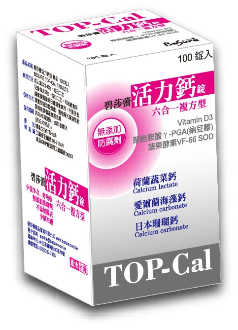 主成分:荷蘭蔬菜鈣、愛爾蘭海藻鈣、日本珊瑚鈣、台灣納豆膠、SOD蔬果酵素、瑞士維生素D3