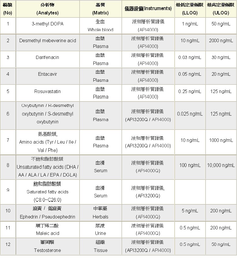 1、分析方法委託開發/諮詢:依客戶需求提供分析方法開發之咨詢服務或直接接受委託,於分析方法開發完成後,再行移交給委託客戶。已完成之檢測方法(Developed methods for customers)