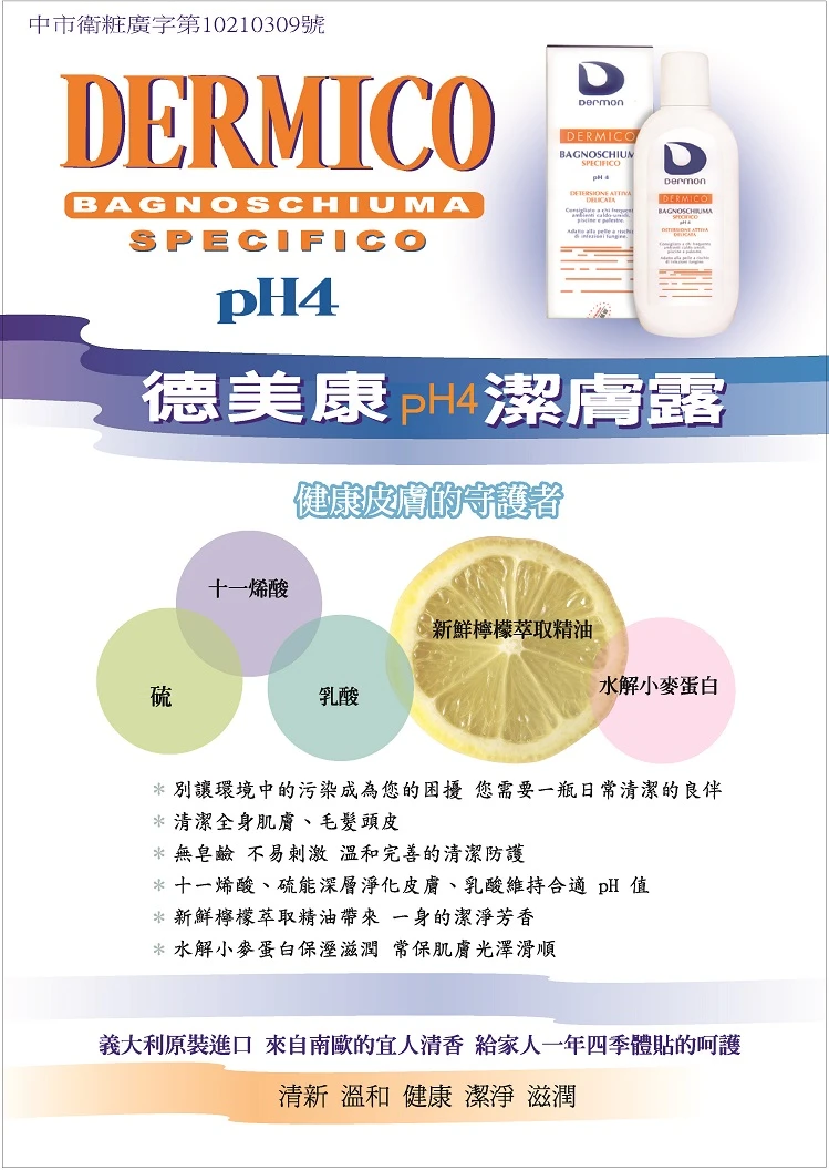 含十一烯酸.硫.乳酸,添加水解小麥蛋白.檸檬萃取精油,PH值4,為健康皮膚的守護者。