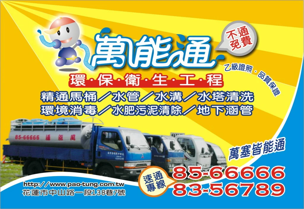 ~『萬能通環保工程行』在花蓮是一家成立20多年的合法老店,本著『以客為尊』的商業理念,在花蓮早已樹立了良好的口碑。一直以來,服務的範圍囊括整個大花蓮13個鄉鎮市,以豐富的經驗為親愛的鄉親們提供:清理馬桶、水管、水溝、涵管、抽肥、污泥處理、水塔清洗與消毒...等,且於101年增加了清溝車-出租服務喔!萬能通衛生工程在業界裡由於有著精湛的專業技術與設備、成立至今已獲得眾多社區、大樓、工廠、以及知名企業、和公司的肯定。