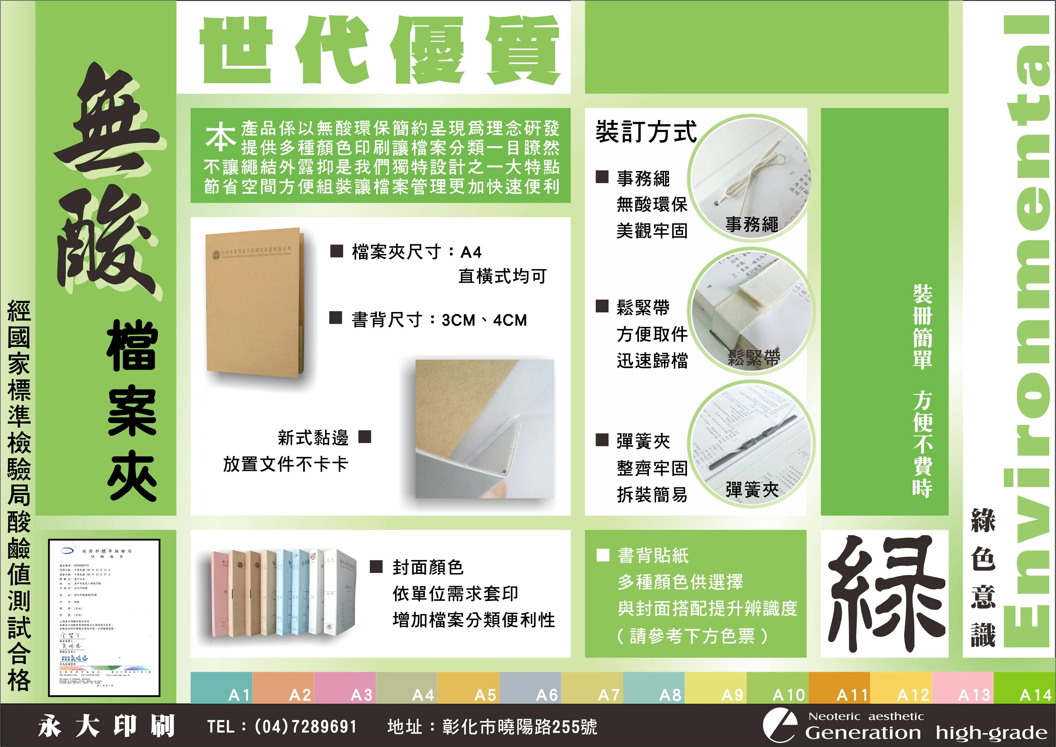 無酸檔案夾本產品為簡化型紙板檔案夾,具簡易經濟特點,紙板經去酸處理後,燃燒時不產生惡臭,亦不對環境造成傷害,正符合現今環