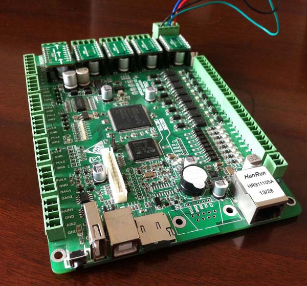 它内含5路步进电机驱动器,4路脉冲/方向信号输出(共用5路步进驱动器其中4路) ,8路光耦输入,8路光耦输出,USB接口 ,网络接口,sd卡槽。