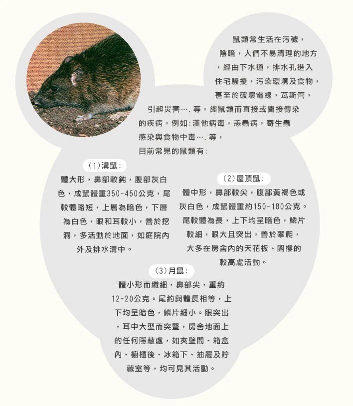 鼠類常生活在污穢,陰暗,人們不易清理的地方,經由下水道,排水孔進入住宅騷擾,污染環境及食物,甚至破壞電線,瓦斯管,引起災害...等,經鼠類而直接或間接傳染的疾病,例如:漢他病毒、寄生蟲感染與食物中毒...等,目前常見的鼠類有