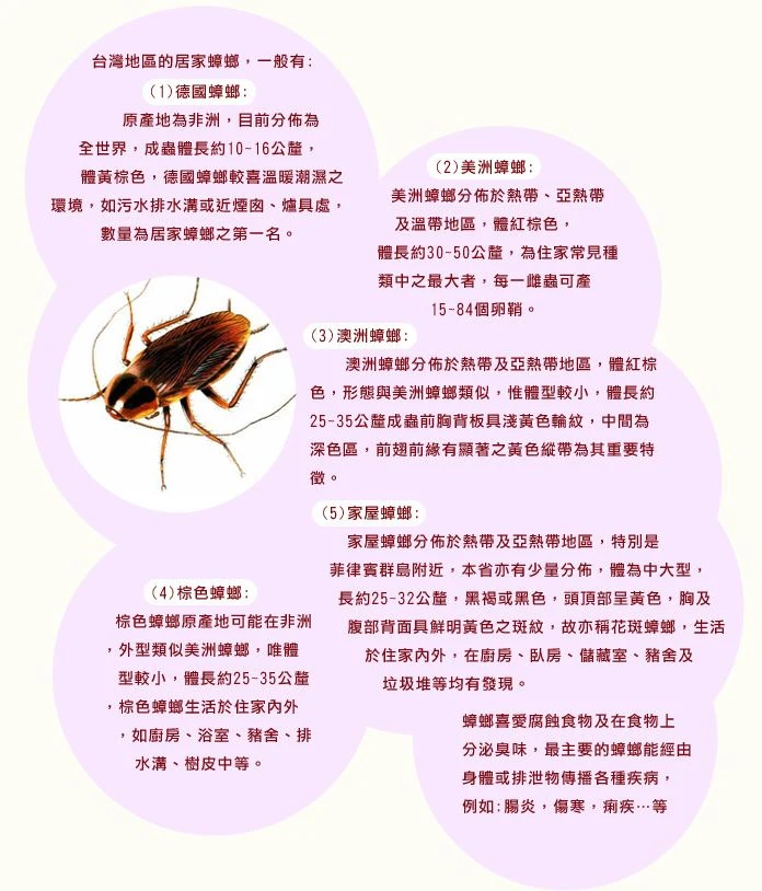 蟑螂喜愛腐蝕食物及在實務上分泌臭味,最主要的蟑螂能經由身體或排泄物傳播各種疾病,例如腸炎、傷寒、痢疾... 等.