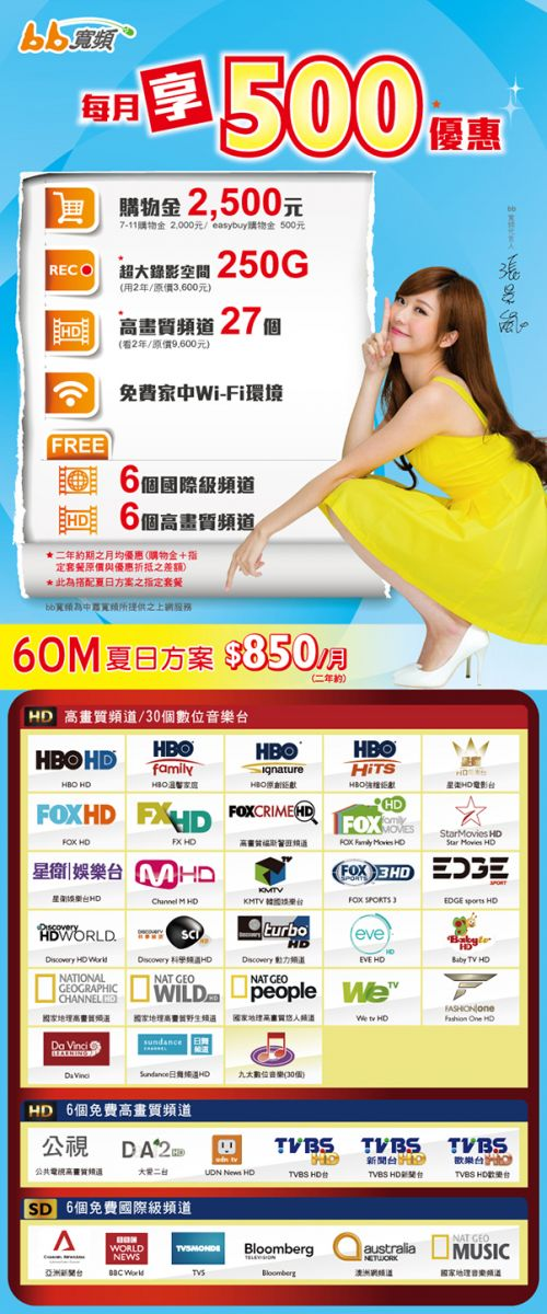 同時申裝60M/5M網路優惠合約價724元搭配指定之HD數位頻道套餐及250G節目雲端儲存空間功能後為850元/月,特別促銷