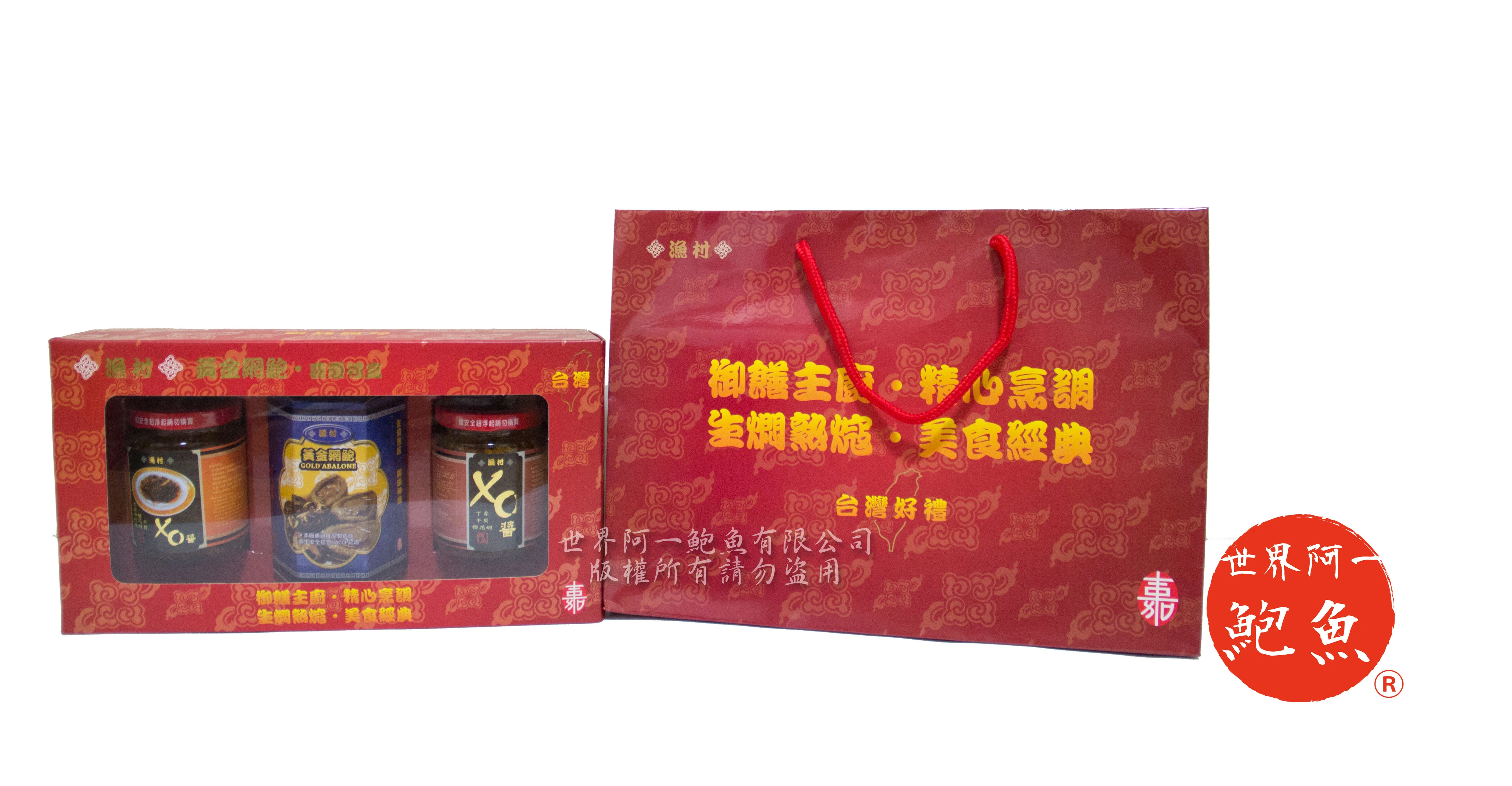 內含:黃金網鮑×1罐+干貝櫻花蝦XO醬×1罐+吻仔魚干貝XO醬×1罐,附紙袋