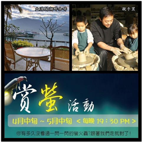 辦理住房手續後,於大淶閣1F「湖畔咖啡」享受精緻的下午茶,再於「親手窯」體驗捏陶樂趣。季節限定「日月潭星光賞螢活動」[4月中旬至5月中旬]。