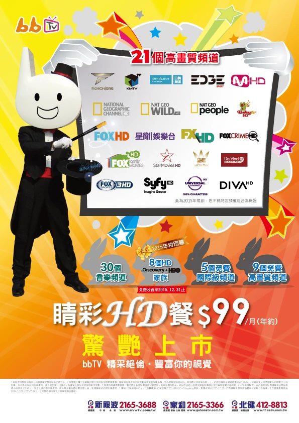 bbTV 精采絕倫,豐富你的視覺 現在申裝 輕鬆擁有 5個免費國際級頻道+21個知名高畫質頻道+30個數位音樂頻道 還有Discovery+HBO家族8個HD頻道(免費收視至2015.12.31止) 同時申裝有線電視、bb寬頻另享優惠 優惠期間自即日起至104年2月18日止 詳情請洽 中永和區 新視波有線電視 http://www.nvwtv.com.tw/ 2165-3688 三峽鶯歌樹林區 家和有線電視http://www.gahocatv.com.tw/ 2165-3366 桃園北區 北健有線電視 http://www.t1catv.com.tw/ 412-8813 |