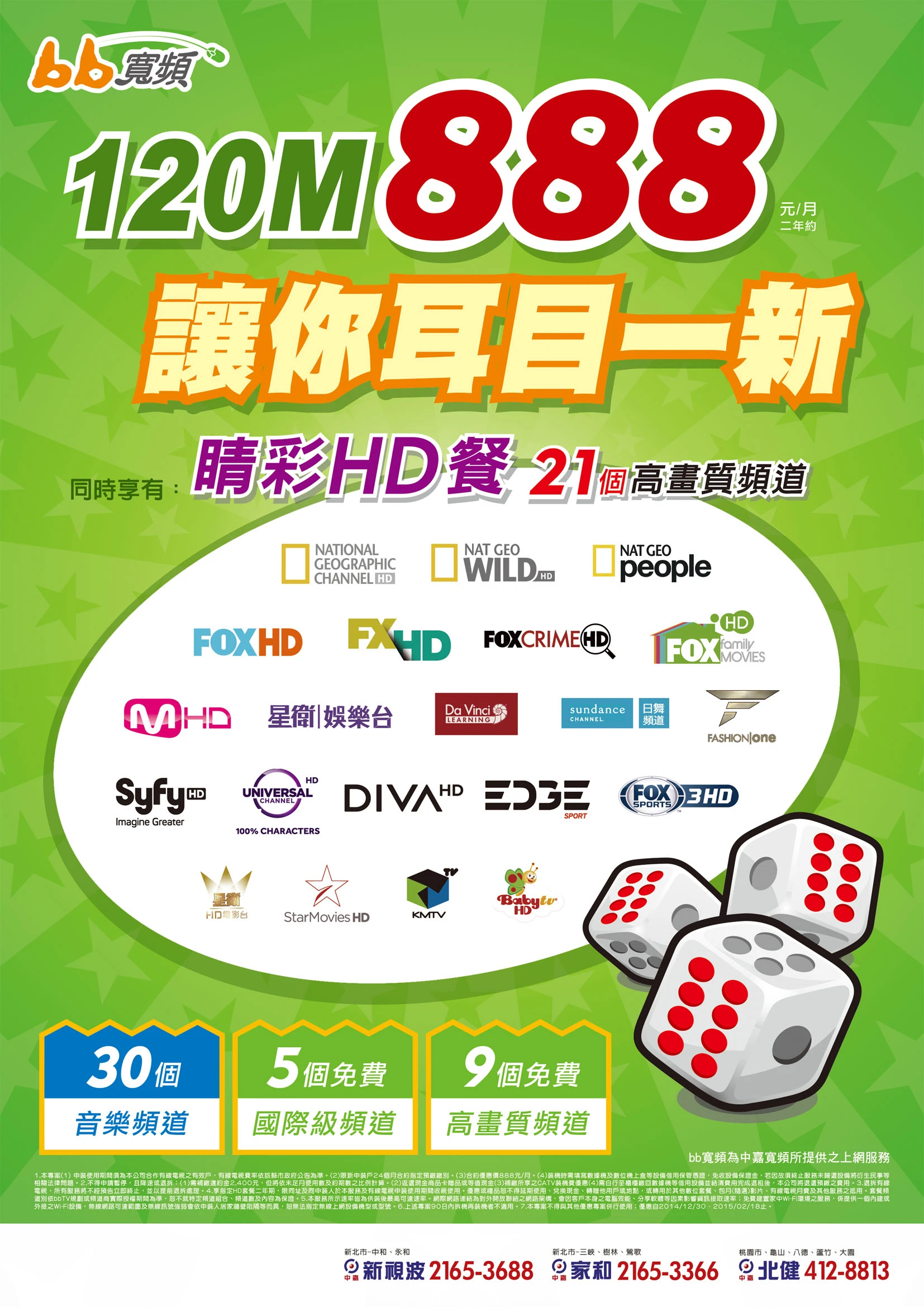 新春喜8樂-bb寬頻120M要$888/月,立即享受高速上網服務及高畫質電視節目! 現在申裝bb寬頻120M,立即享有2,000元7-11商品卡!21個高畫質頻道和30個數位音樂頻道,再免費建置家中無線Wi-Fi環境。 現在就速撥24小時裝機熱線2165-3366 同時申裝有線電視另享裝機優惠唷! 優惠期間自即日起至104年2月18日止 詳情請洽 三峽鶯歌樹林區 家和有線電視http://www.gahocatv.com.tw/ 2165-3366 中永和區 新視波有線電視 http://www.nvwtv.com.tw/ 2165-3688 桃園北區 北健有線電視 http://www.t1catv.com.tw/ 412-8813 |