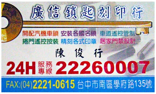 廣信鎖匙刻印行04-22200850為考取專業證照鎖匙店鎖匠