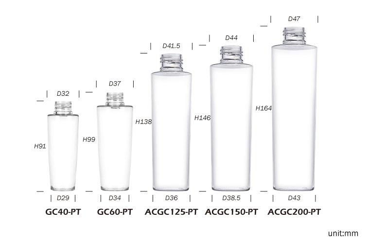 | ACGC200-PT | PETG | D 47 × H 165 mm | 200 ml / 7.05 oz | 24 / 410 | Bottle Only |