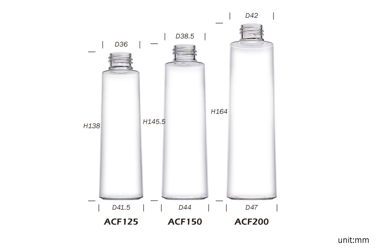 | ACF125-PT | PETG | D 41.5 × H 138 mm | 125 ml / 4.41 oz | 24 / 410 | Bottle Only |
