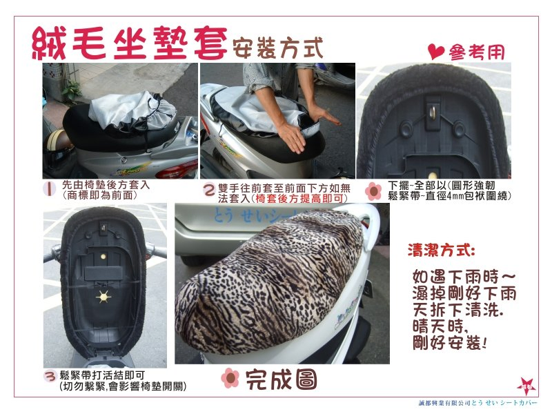 建議: 絨毛坐墊套5~7天拆下清洗,隨時保持坐墊套乾燥