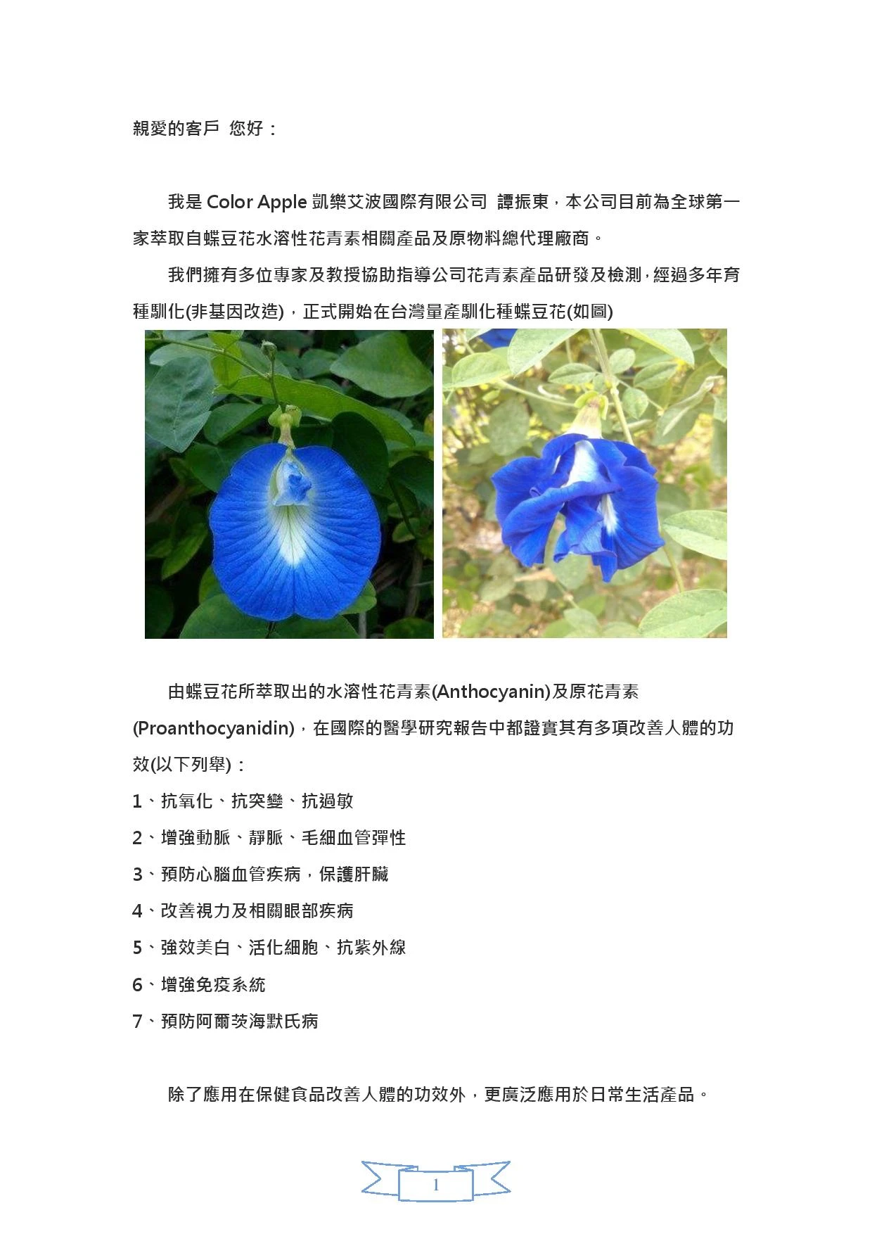 我們是Color Apple凱樂艾波國際有限公司,本公司目前為全球第一家萃取自蝶豆花水溶性花青素相關產品及原物料總代理廠商。我們擁有多位專家及教授協助指導公司花青素產品研發及檢測,經過多年育種馴化(非基因改造),正式開始在台灣量產馴化種蝶豆花