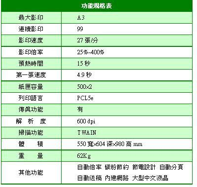 功能先進 操作人性的網路文件解決方案繼承 Aficio 高品質的優良傳統機身構造簡單 故障率低 最高解析度 600 dpi 影像更銳利內建 PCL5e網路高速印表功能全功能網路印表及網路掃描配備最高傳真速率 33.6 Kps 並可以執行PC傳真加配雙面單元 可雙面列印 同步雙面影印