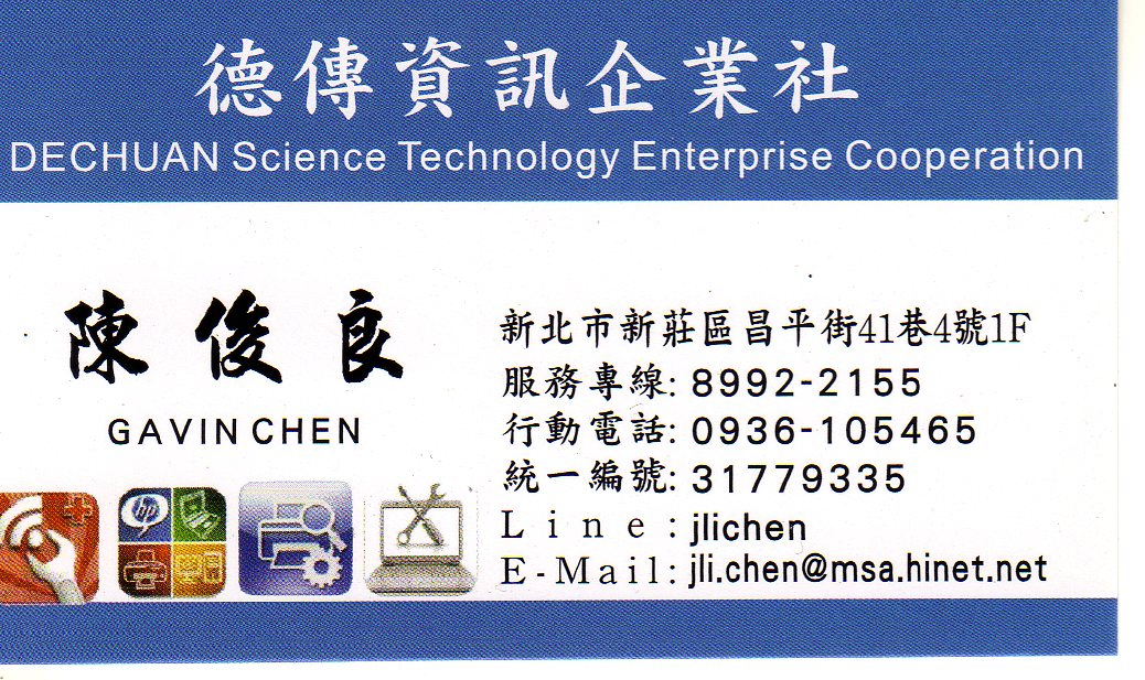 ◆公司名稱:徳傳資訊企業社 ◆門市地址:新莊區昌平街41巷4號1樓 ◆服務時間:上午 :10:00 ~ 晚上 21:00 午休時間中午12點~下午1點30分 ◆聯絡方式:電話:89922155 行動:0936105465 LINE:jlichen 陳先生 ◆服務項目:各型廠牌電腦維修,電腦重灌, 系統解毒,系統搶救,主機組裝,電容更換, 螢幕維修,驅動程式安裝 ‧各式套裝主機販售, 筆電,液晶螢幕,組裝電腦,零件組裝,電腦中毒搶救, 各式廠牌套裝電腦維修買賣,筆記型電腦維修買賣, 主機板,維修服務,零組件,電腦組裝,各式電腦重灌, 個人電腦安裝,零件送修,維修保養升級,組裝,解毒,防毒 ‧各式資訊產品、各型電腦、液晶螢幕、 液晶電視,印表機,傳真機高價資源回收 (電腦重灌優惠價500元 含免費防毒軟體~)