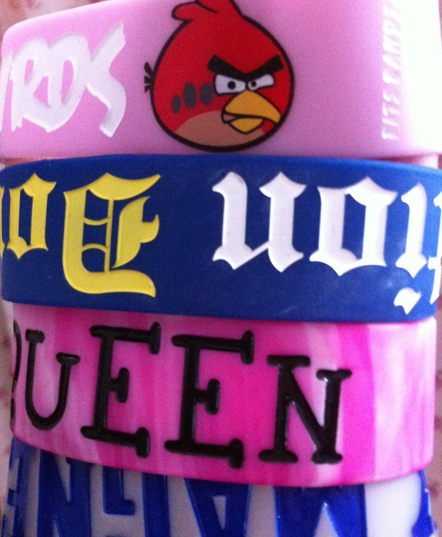 多種不同字體,不同顏色的矽膠手環,由100%環保矽膠(燃燒冒白煙,假冒的冒黑煙,並且發出強烈的刺激性氣味)製成的手環(矽膠手環原材料的質量,也有級別之分,普通料和好料都是環保的,出口發達國家一般要求好料。普通料和好料只不過彈性,色澤,手感,氣味,拉長的回縮性略有不同,外觀大致一樣。