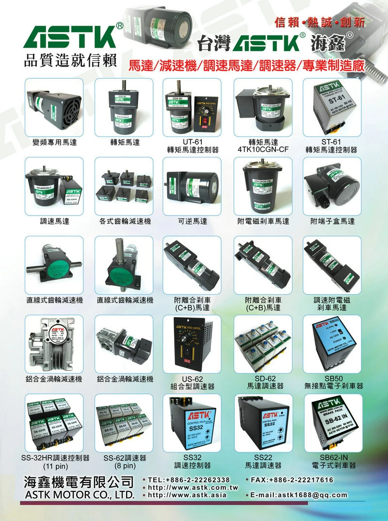 歡迎您的來訪,我們公司秉承質量第一,顧客至上的原則,竭誠為國內外廣大客戶朋友提供優質的服務,希望通過我們的真誠與努力能夠成為您長期的合作夥伴!我公司海鑫ASTK牌力矩電機,ASTK牌交流減速電機,ASTK牌可逆電機,ASTK牌調速電機,ASTK牌電磁剎車電機,ASTK牌離合剎車電機,ASTK牌直線減速機,ASTK牌渦輪減速機,ASTK牌齒輪減速機,ASTK牌調速器