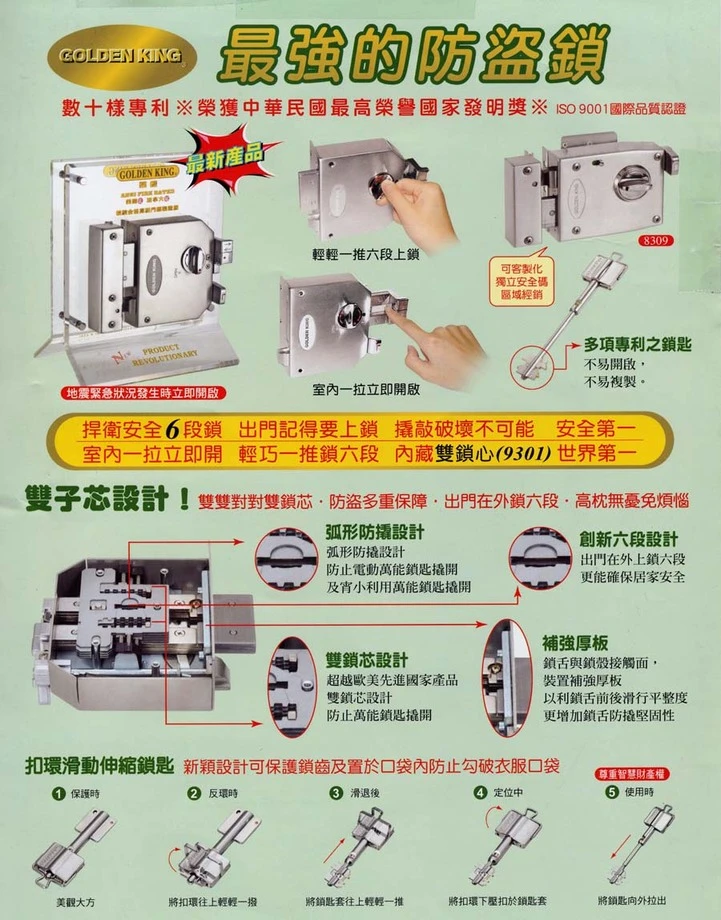 GOLDEN KING金冠牌防盜鐵門鎖-9301雙子芯6段鎖 |