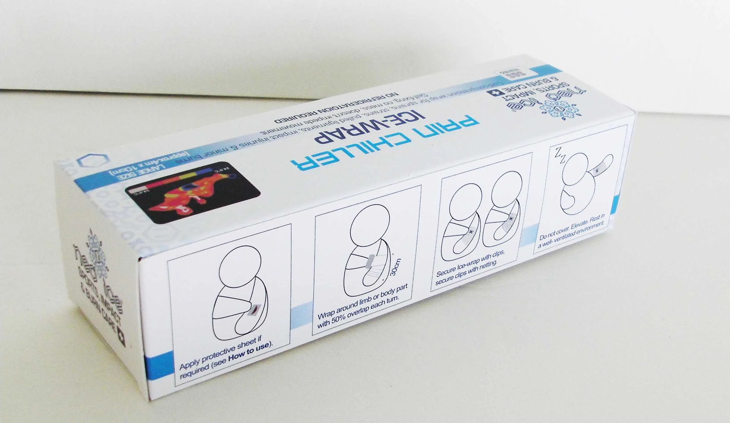 隨拆即用的冰敷用品,繃帶本身即含Neo-ice專利冰涼液,安全降溫6~8度,不含藥物,適骨科診所,復健科,安養院,或運動員激烈運動後之肌肉降溫或傷痛舒緩,攜帶方便,不須冷凍或冷藏,搭配隨身包冰涼液或罐裝冰涼液可多次重複使用,環保經濟又省時