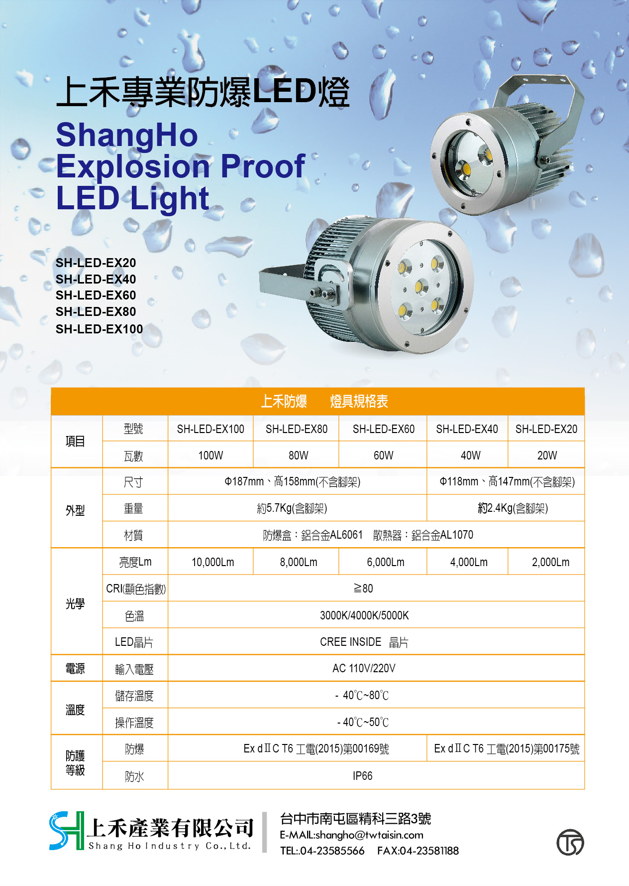 上禾產業有限公司.專業製造防爆LED.20W-100W.採用美國CREE.晶片.全鋁合金.防鹽.防霧.防水防塵等級 IP66.通過CNS