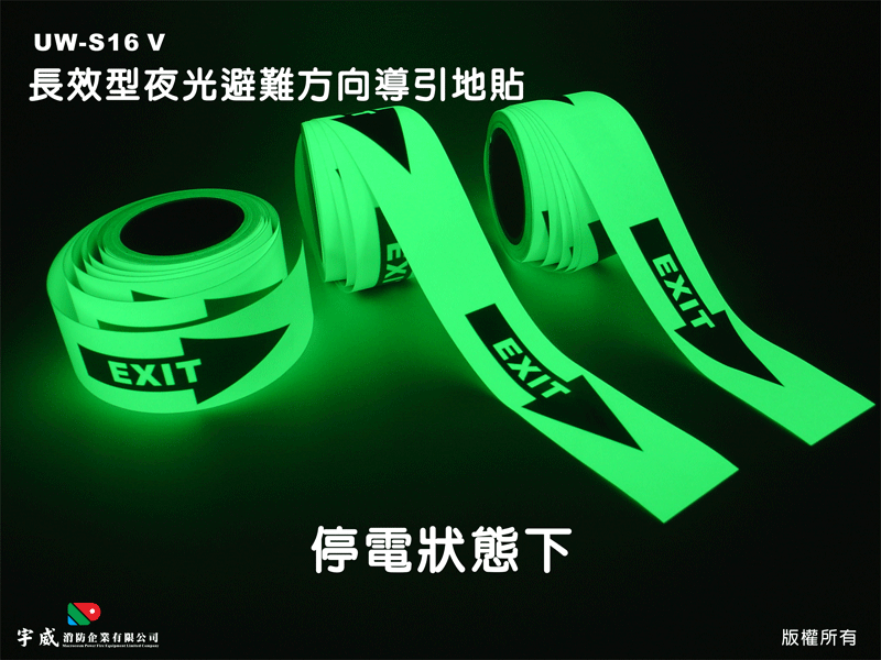 平時可自行吸收日光、燈光、環境散光等各種 可見光源,遇停電或濃煙密佈緊急狀況下,將吸收的能量以可看見光的形式釋放出來,平安引導人員疏散至緊急出口處,維持亮度時間特長,約10小時。