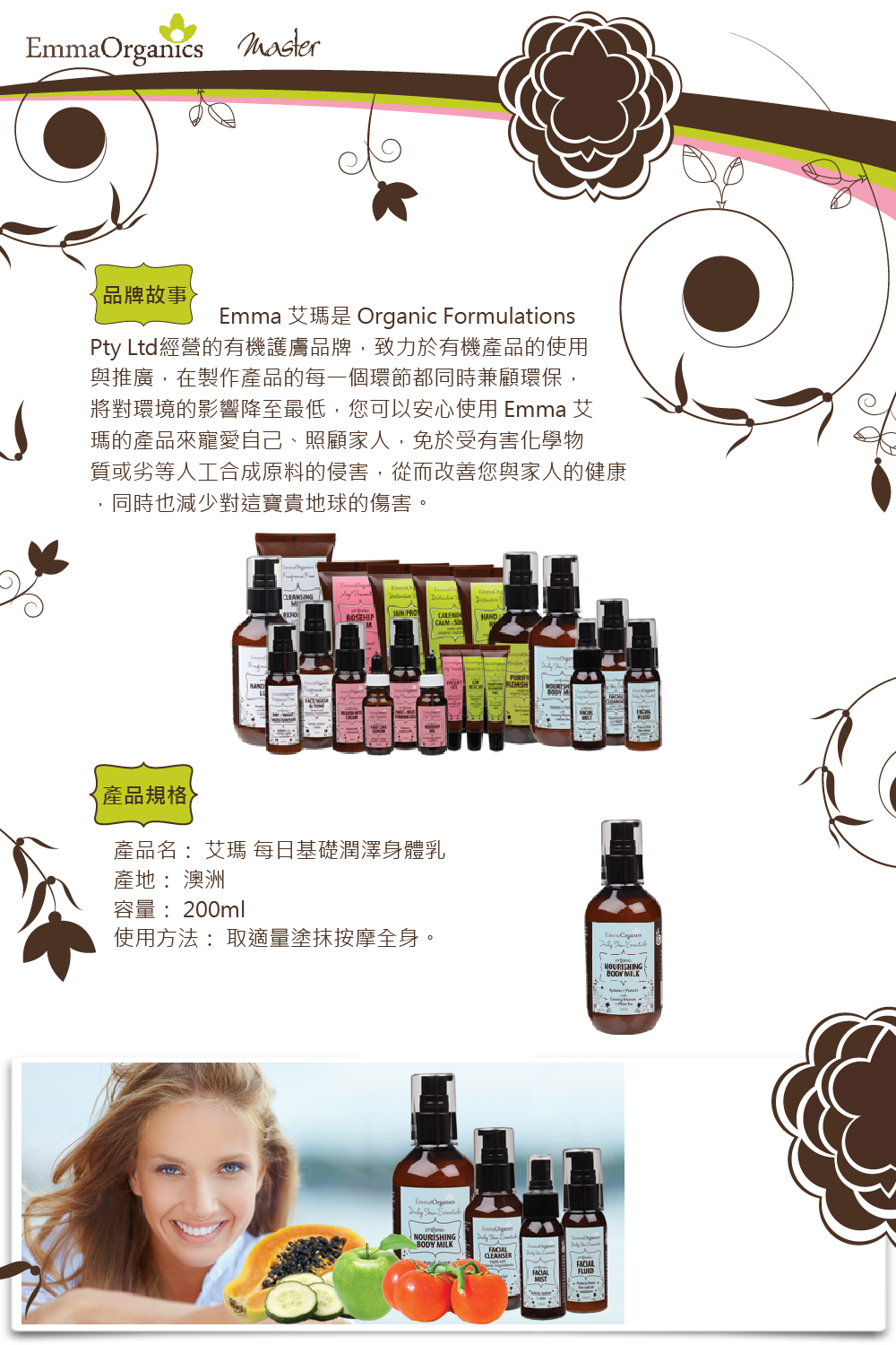 產品名稱:艾瑪 每日基礎身體乳產地:澳洲容量:200ML使用方法:取適量塗抹按摩全身