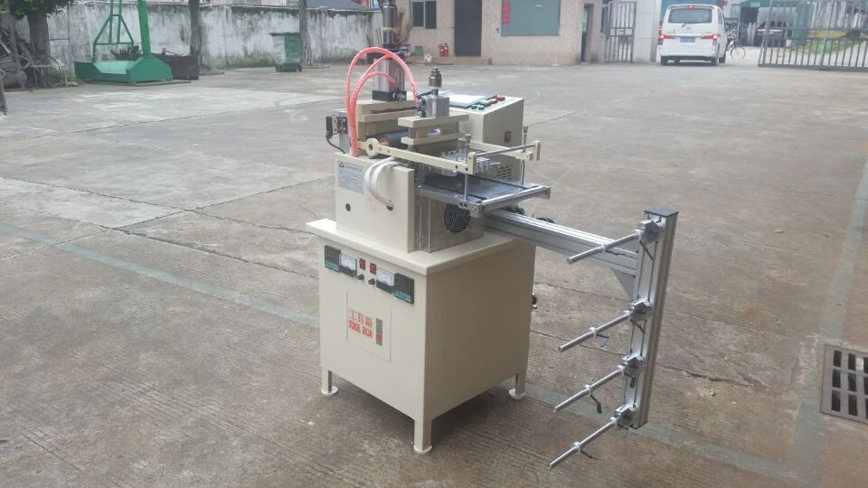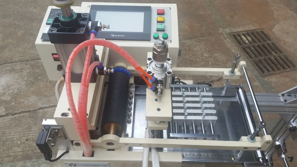 該機器使用氣壓式取代馬達式切刀方式,可裁切各式較厚的帶類材料,並加裝了烙印裝置,可先在織帶上烙印上商標再切片 This machine use the pneumatic replaces the motor-driven cutting machine. This machine can cut off thicker belts. Mark the installation of the machine means, So, This machine can be imprinted on the trademark and then slice the webbing