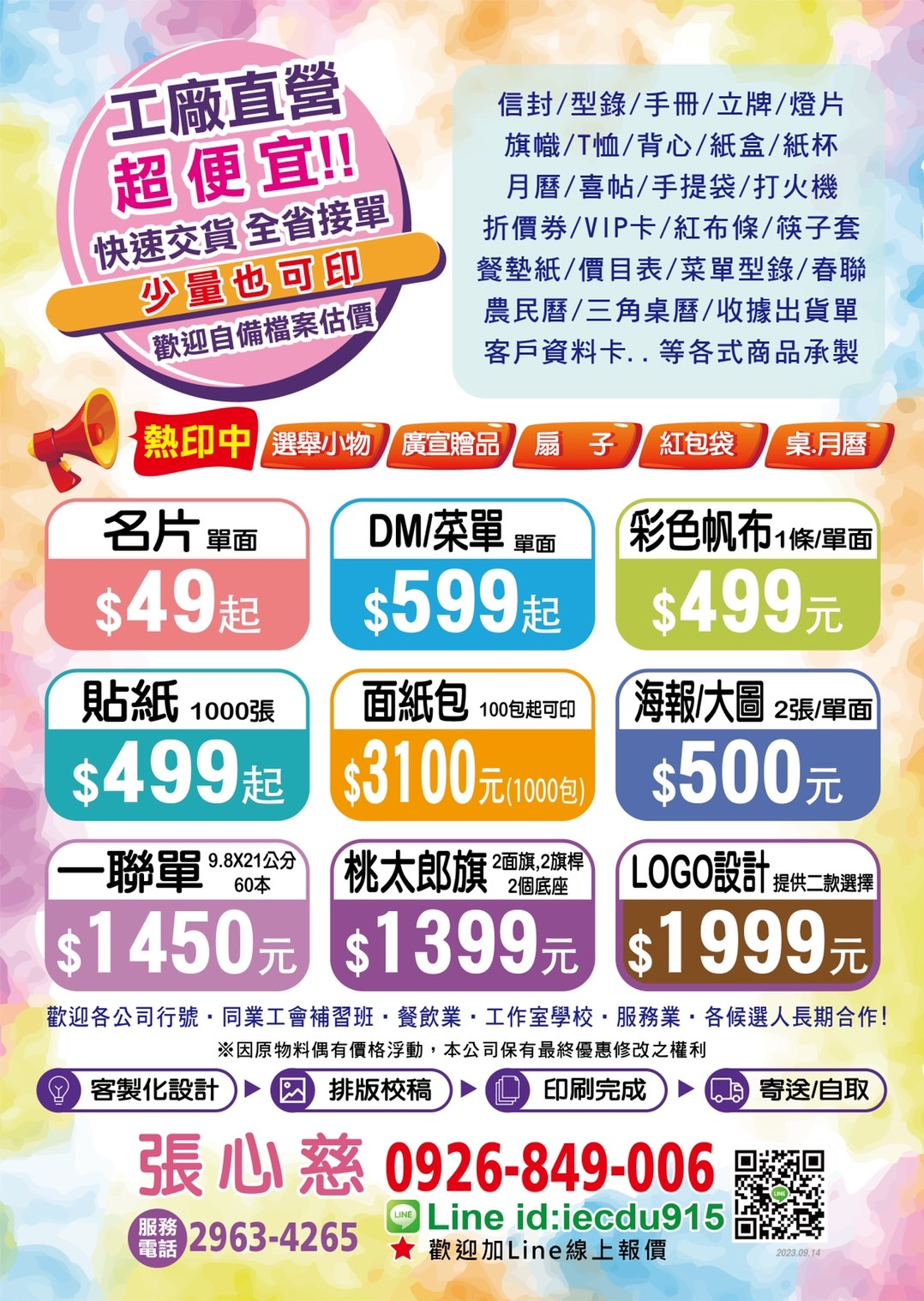 名片、貼紙、信封、聯單、DM、菜單、海報、大圖褕出、立牌、帆布、紅布條、