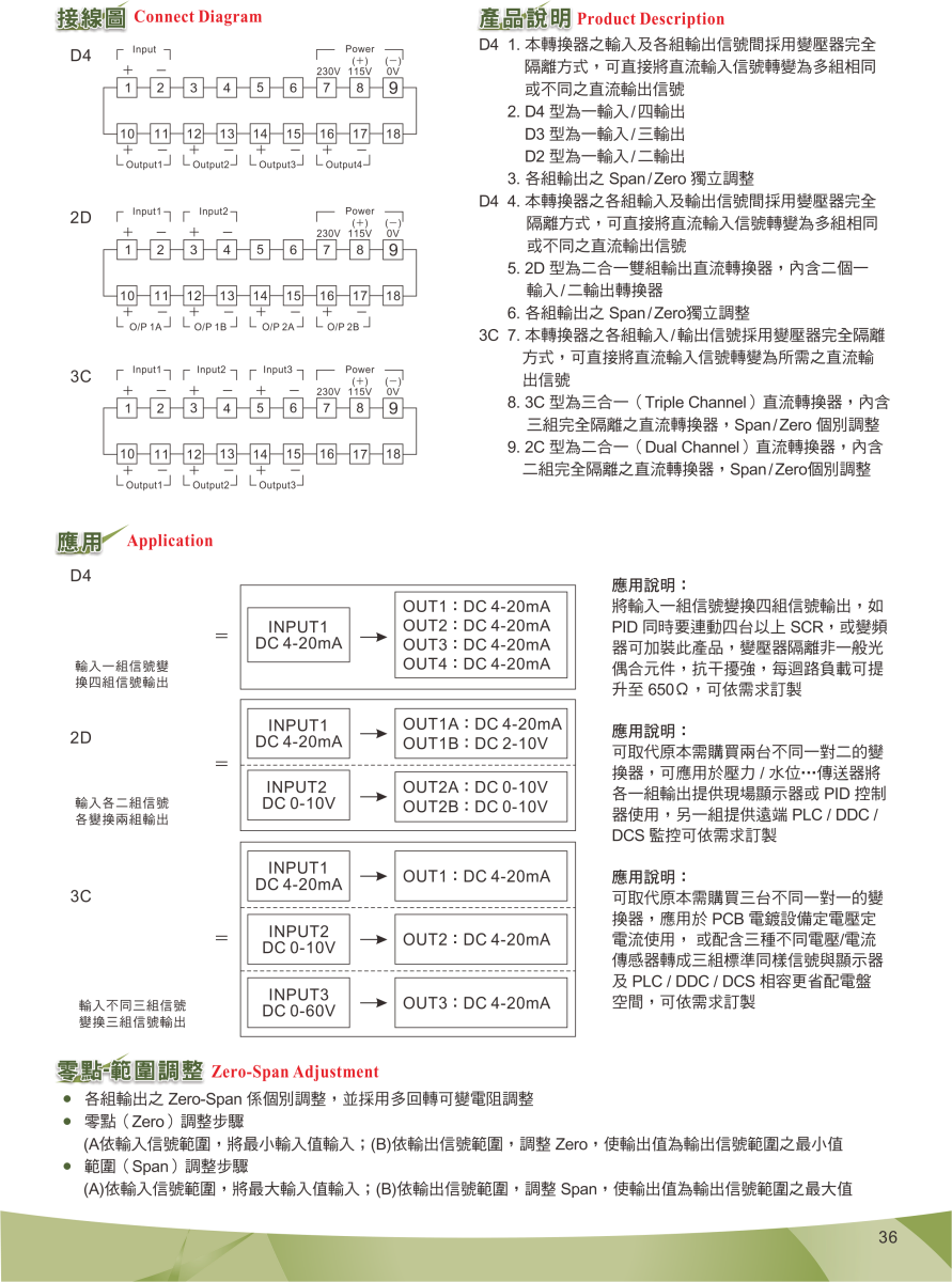 針對各式儀表訊號針對各式儀表訊號輸出DC4-20mA、DC0-10V,做轉換輸出使用,對於遠距離傳輸訊號衰減、有訊號負載提升之功效、可防雷擊突波宇變頻器干擾之間問題改善使用