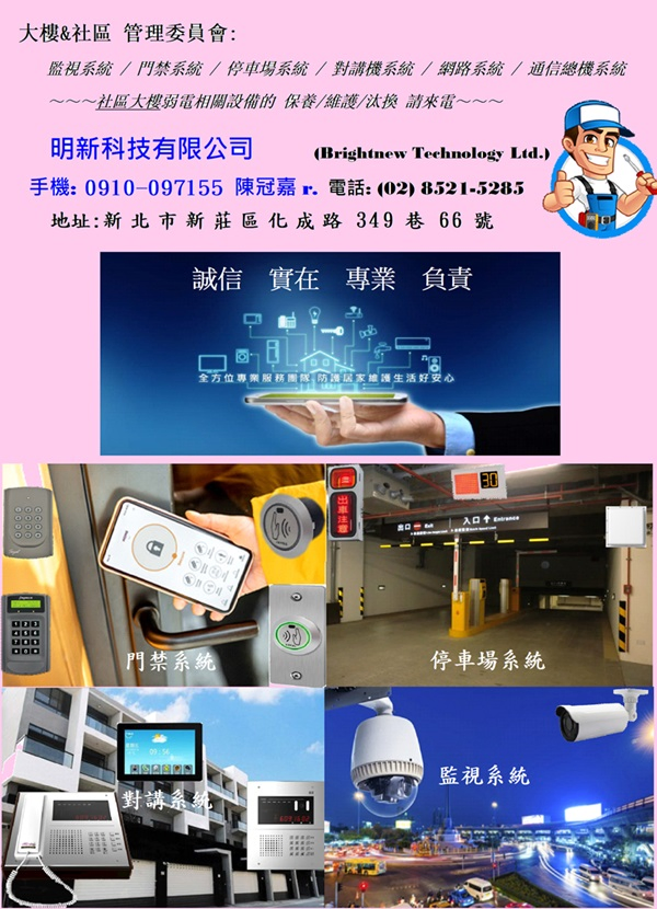 雙北市地區之監視系統、電話總機系統、大樓對講機系統、資訊網路系統、門禁刷卡系統、停車管理系統等……之設計規劃、施工、維護的專業公司