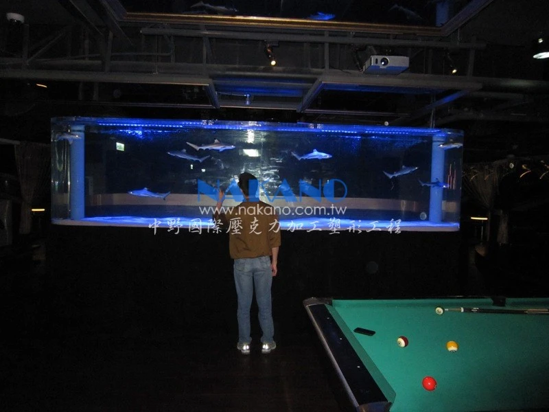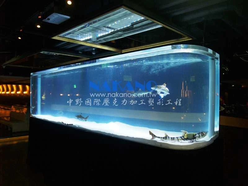 養8條伯爵鯊的空間.. 考量5噸海水的水壓 以厚達40mm的水晶壓克力 施以烘烤塑形工法、無縫接合工法 塑造出長達5米的大型水族箱