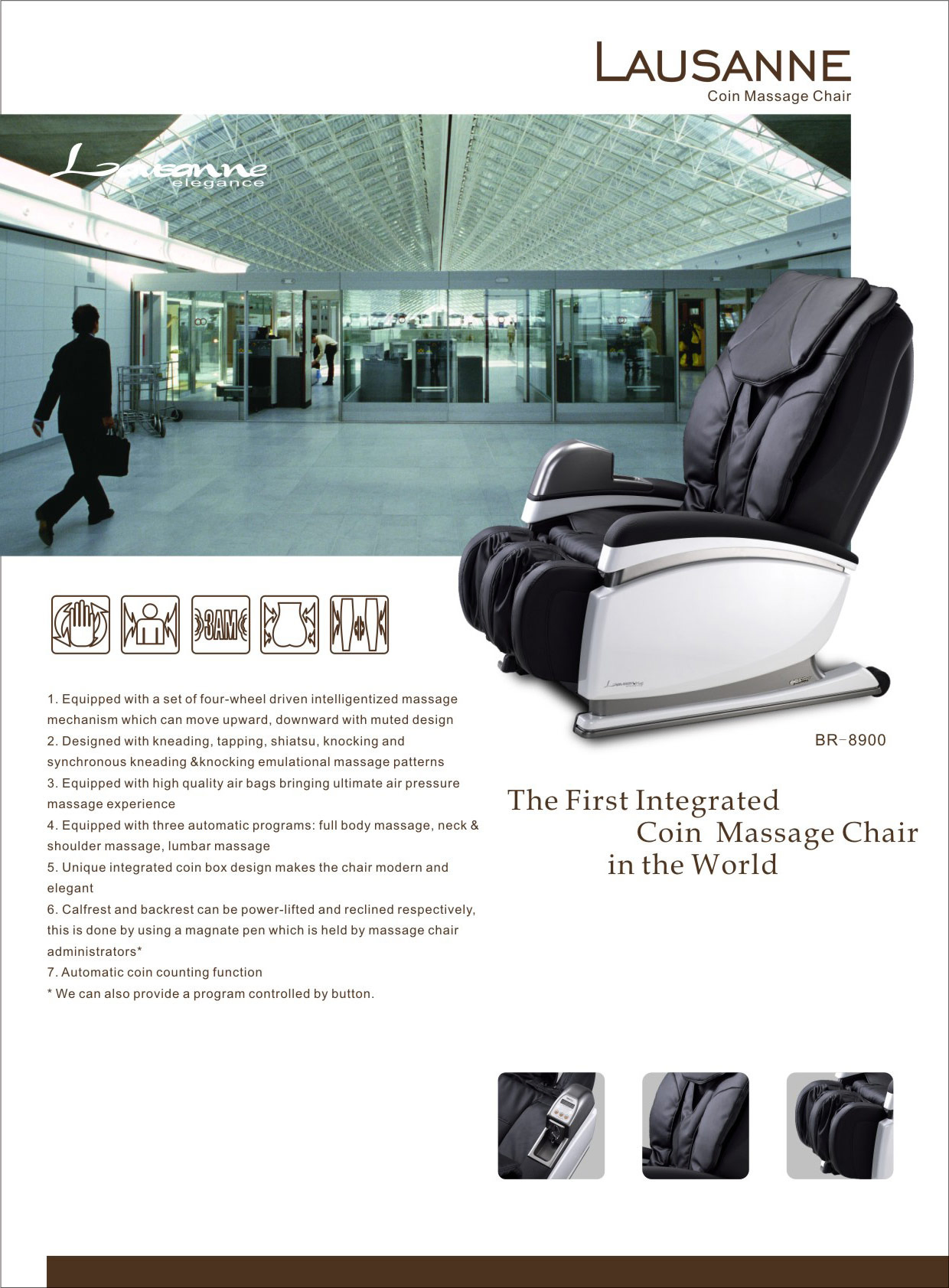 BR-8900洛桑系列投幣式按摩椅—和諧靈動,營造成就 歐式現代風格,西班牙設計師設計,造型最具現代感! 彰顯品味 四輪機械手智慧按摩,3組全自動模式和6種技法,可上半身、局部、定點等部位按摩 鋼琴烤漆側板 具臀部、小腿氣壓式按摩和滾輪振動按摩功能 靠背、小腿電動升降,最大角度165度 可自行設定幣別! *本售價為46000(含運費.含稅價)* 連絡我們: 行動:0923-693600 藍經理 出租: 長期:一年以上 租金:依按摩椅新舊和擺放地點而有所不同,約每個月1400-2200元 押金:8000元/座 投幣收入歸貴單位! 器材的購置.保養.維修.零件更換.卡幣處理.收幣管理皆由快樂芽負責,貴單位僅需負擔清潔工作,且會在器材上貼上敝公司的聯絡電話,有問題會馬上處理,貴單位完全不用費心! 短期: 項目 1座 2-3座 4-9座 10座以上 1天 不做 3200 2800 2500元/座 2-10天 每座每天加300元(累計式) 11-30天 每座每天加200元(累計式) 31天以上(含) 每座每天加100元(累計式) 每座押金15000元,租後扣除租金退還 按摩椅若有損傷則斟酌損傷嚴重性扣除(小傷不需扣除) 以上價格皆不含運費! 以上價格皆不含稅,含稅另加5%! 投幣收入歸貴單位! 寄放: 適合人出入多的地方! 方案一:快樂芽支付租金:視擺放地點而點而定 方案二:快樂芽和貴單位拆帳,拆帳比例視擺放地點而定