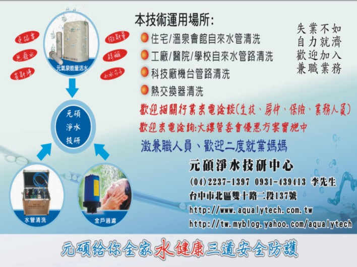 您相信自來水可以生飲的說法嗎? 您以為水煮沸殺菌後就是安全的嗎? 為何大家知道每年都要清洗水塔2次? 日本歐美地區清洗水管習慣已行之多年, 九成國人卻不知全戶水管清洗的重要性! 我是專業全戶型水管清洗達人 提供全戶過濾, 水管清洗 ,能量淨水機,能量水 , 健康水噹噹