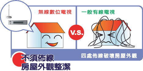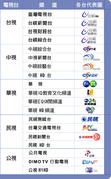 認識無線數位電視 目前家庭使用的電視是類比電視(Analog TV),我們所收看的電視節目的畫面就是類比訊號,而有別於平常使用的電腦及網路中看的到文字及影像,其產生方式就是數位式的(Digital), [ 數位化」就是把音樂、電視、電話......等聲光變化產生的「類比訊號」,轉換成「數位訊號」,亦即只有0與1兩個數字組成的「二進位」型式訊號(類似 電腦系統中資料處理之訊號),透過數位訊號處理,可以消除雜訊和千擾,畫面將會更清、細致,同時也提供身歷聲(杜比AC3)的高音響效果。 電視及節目訊號數位化後,數位訊號經「壓縮」,使得一個數位頻道可播送三至四個節目,比 一個類比頻道只能播送一個節目,有更多節目選擇,無線數位電視還可以使用於戶外及行動接收,不再侷限於室內,並且可與相關多媒體數位產品,彼此整合支援流 通,其與網路結合後,可成為多媒體家庭服務平台(MHP) a.免費接收 裝機上盒或買內建數位接收的電視機,不用再繳月租費,看電視真的不要花錢! b.安裝簡易: 只需購買機上盒,無線接收,不須四處佈線,破壞房屋外觀。 c.行動收視 私家車、計程車、大眾運輸載具均可安裝車用機上盒,時速高達130公里,仍可清晰接收。 d.戶外收視 在戶外亦可收訊,讓您可以不再受限於室內,在外也可享受高品質的數位電視節目。 e.電腦收視 任何電腦(PC、NB)皆可收訊,甚至不必開電腦主機即可收看無線數位電視。 f.政府明確宣示 將於2006年有條件收回類比頻道,全面改採數位訊號播出。 g.輕鬆擁有13-15個頻道,適合全家觀賞 國人看了42年類比電視,正式邁入全新的數位電視時代,台灣的無線數位電視系統,2004/6/1陸續開播,台視、中視、華視、民視及公視等無線電視台, 將提供更高品質、不受干擾的數位電視節目。目前各台推出頻道內容包括新聞、戲劇綜藝、體育及社教等。 下圖為數位電視頻道表(已於2005年8月更新) 可與相關多媒體數位產品彼此整合,讓彼此之間可互相支援流通,而成為多媒體家庭服務平台(Multimedia Home Platform/MHP)。