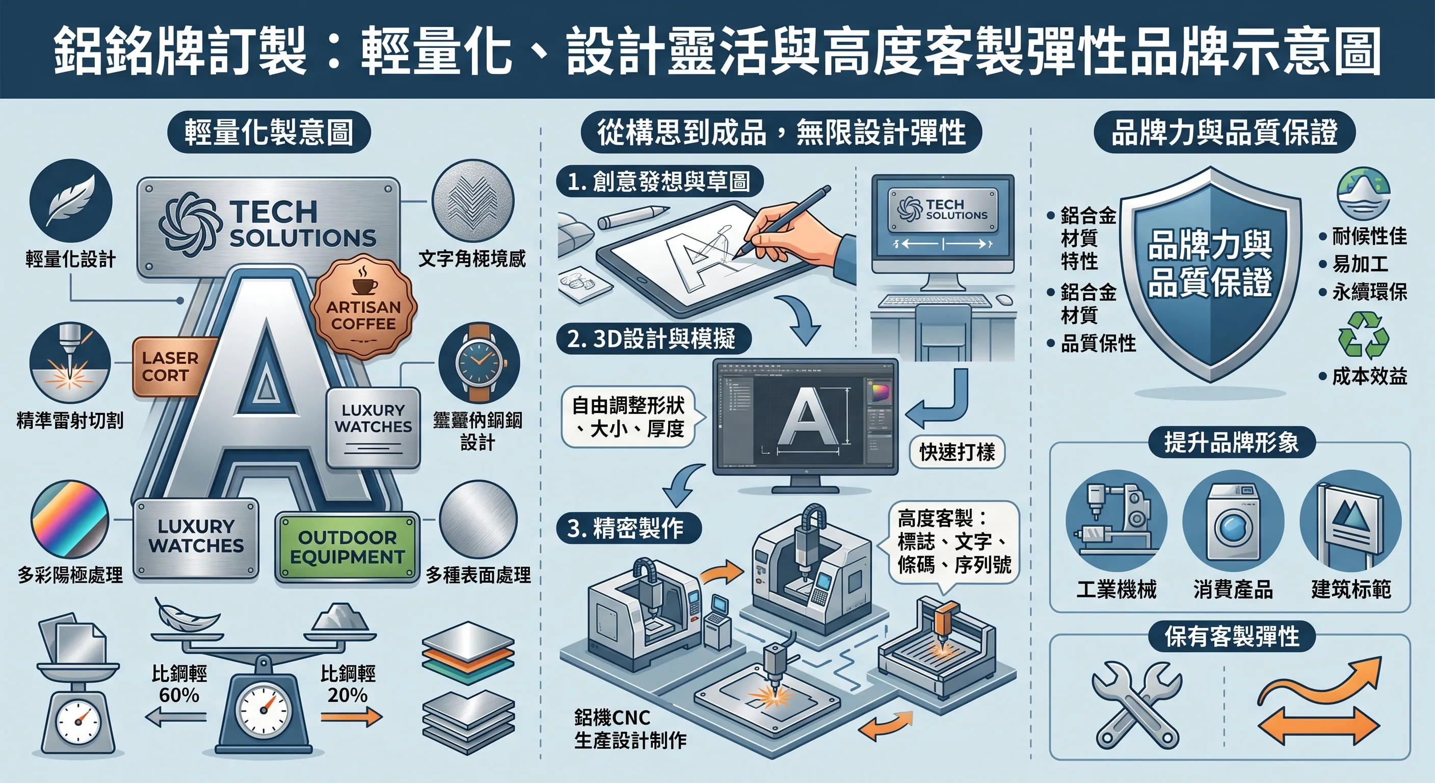 在眾多金屬材質中,鋁材始終是市場上最受歡迎的選擇。需要輕量化、設計靈活、又想保有高度客製彈性的品牌,鋁銘牌訂製幾乎是標準答案。