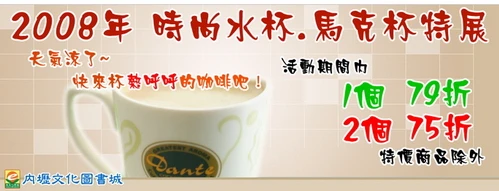 天氣涼了,來杯熱呼呼的咖啡吧~ 活動期間內,購買水杯、咖啡杯,一個79折;2個(含以上)75折 特展只到2008年12月25日喔~要買要快唷~送禮自用兩相宜的好東西喔~ 內壢文化圖書城 桃
