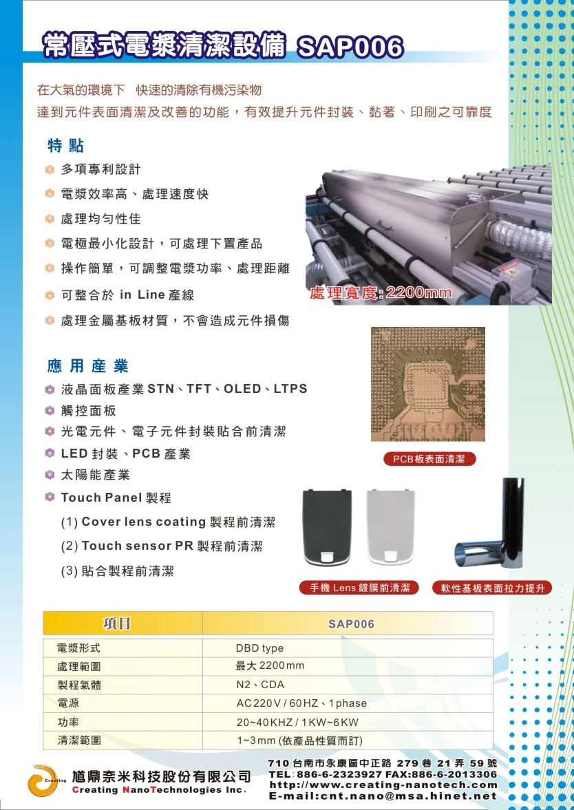 在大氣的環境下,快速的清除有機污染物 達到元件表面清潔及改善的功能,有效提升元件封裝、黏著、印刷之可靠度