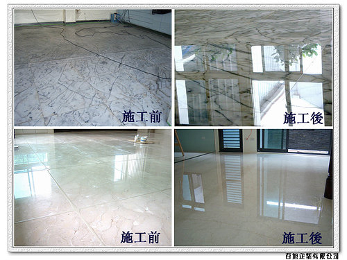 較高價位的房子常採無接縫的工法來處理大理石 大理石無縫處理的優點為: 1.接縫光滑、不變黑變髒 2.填縫材具彈性,可吸收部分地坪側向擠壓之力量,石材接縫較不會因溫度變化,體積膨脹而碎裂 3.減低石材底部空心之發生機會 4.平整 ;幾乎摸不到接縫位置 5.美觀,某些石材完工後幾乎看不到接縫 6.接縫不易脫落;水泥填縫一段時間後常會脫落 大理石無接縫的填入材有哪些? 較常用者有下列三種: 1.半固(鏝刀型)樹脂補膠:易施工,價錢低廉,但填補深度淺,易脫落 2.流入型樹脂補膠(poly):易調色,完全填滿接縫,不易脫落 3.環氧樹脂補膠(epoxy):不易調色,完全填滿,耐候佳,不易脫落,但價錢較高哪些石材可以做無縫施工? 一般而言只要是採研磨加工出來之材質均可施做,如大理石、化石、玉石、花崗石、拋光石英磚、結晶化玻璃均可。 但一般而言,軟石類如大理石、化石、玉石較易施工,效果也較好。硬度較高之材質,因研磨費工費用相對較高。 石英磚要看材質,若紋路是表面噴印上去的,研磨後色澤紋路會跑掉。 大部分之石英磚結晶化玻璃,表面都有經過特殊加工較為細緻緊密,相對也較耐磨,通常研磨後會出現氣泡針孔,且磨後光澤亮度有時候會變差,耐用性也會降低,因此若非必要,並不建議研磨,因此也不建議做無接縫處理。無接縫施工標準工法如下: 一. 先透氣:石材安裝後須經一周以上之硬化養生期,待水泥砂漿固化,水氣排乾至一定程度後,才可施做。二. 接縫清理:使用薄型切片(約1㎜厚),不加水切縫,並使用吸塵器將縫內砂土、灰塵吸淨,缺角須一併整修。 三. 補膠調色:使用分色法,比對石材顏色確認顏色無誤後依比例加入硬化劑,注入接縫,調色順序為透明度、色度、色比、鮮度、明暗。 四. 接縫整平:須使用5HP馬力以上之機器作全面整平作業,至石材亮面完全磨除,磨平為止。 五. 研磨:使用鑽石磨片依序磨亮。 六. 拋光:依石材種類選擇適用之拋光粉拋光後即完成