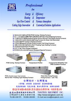 在台灣設計製造生產,各種工業用爐、電子機械設備、電子儀器生產研發SMD迴焊爐,BGA迴焊爐,QA實驗室測試用爐,PCB烘烤用爐,乾燥爐,厚膜燒成爐(燒結爐),高溫氮氣燒成爐(燒銅爐)(氣氛燒結爐),高溫箱型爐,血糖試片用爐,CIGS硒化爐,爐溫測試儀等。