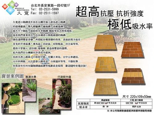 久寬進口陶磚,多年來蔚為台灣市場陶磚的領導廠商,各種式樣陶磚