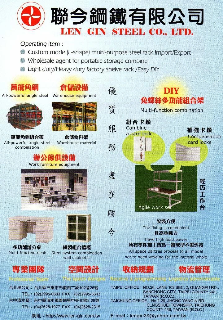 本公司創立至今已有20多年之歷史,台北營運總部在台北縣三重市,自有工廠在台中清水,以量產萬能角鋼及DIY免螺絲架為主。尚有各類型輕、中、重型架、移動櫃、倉儲設備及各式各樣多元化產品等。本公司一路走來均秉持著生產高品質、高格調的產品,以利消費者使用起來安心、美觀、耐用為主要宗旨。故本公司生產原料均來自中鋼公司之一級品材質,全部自行採購進貨,自行生產,銷售及安裝服務,並有中鋼公司之品質保證,無輻射、無污染證明保證,更有本公司售後服務之保證等。