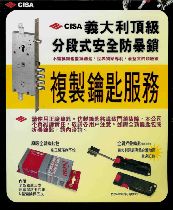 右圖為cisa義大利頂級分段式安全防暴門鎖 (本店有開鎖及換鑰匙變鎖匙服務喔)明佳鎖店 大台北市24小時開鎖.裝鎖服務>士林區.北投區.內湖區.中山區.大同區.萬華區.中正區.松山區.信義區.大