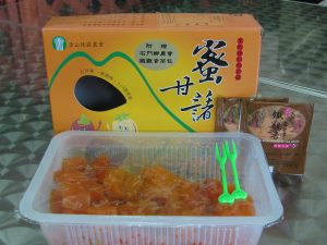 金山鄉農會總幹事李清煙表示,甘藷蜜餞有兩款,分別以台農57、66號甘藷為生產原料,前者澱粉質多、口感Q軟,後者甜度較高、口感鬆綿,蜜甘藷禮盒內附鐵觀音茶包2包,甜而不膩的蜜餞,佐飲回甘好茶,「藷香、茶香在口齒留香」,8月中旬還要推出甘藷軟糖、酥餅、麵線等新產品。