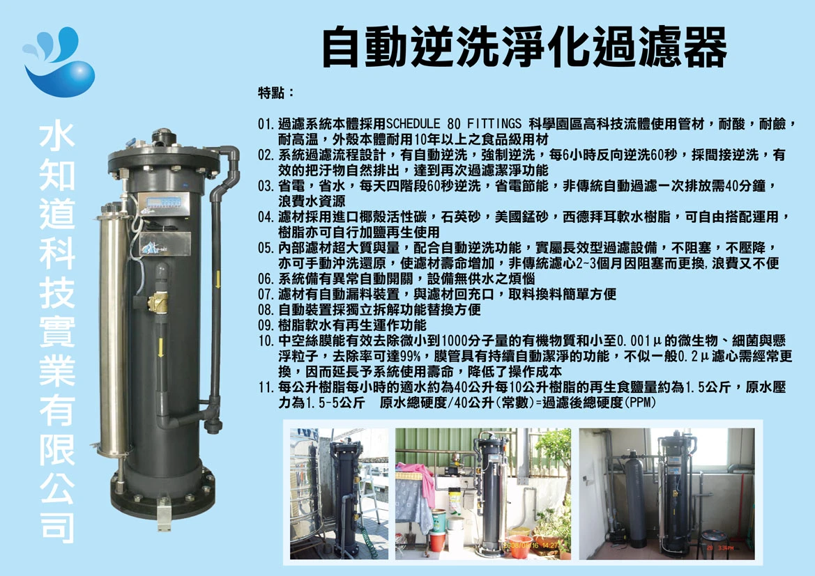 自動逆洗淨化過濾器特點■過濾系統本體採用SCHEDULE 80 FITTINGS 科學園區高科技流體使用管材,耐酸,耐鹼,耐高溫,外殼本體耐用10年以上之食品級用材■系統過濾流程設計,有自動逆洗,強制