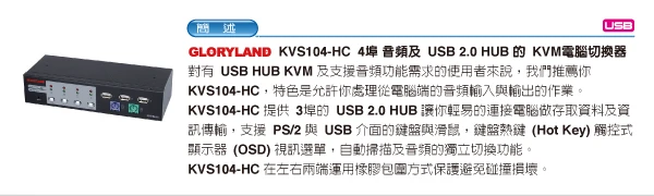 GLORYLAND KVS104-HC 4埠 音頻及USB 2.0 HUB的KVM電腦切換器 對有USB HUB KVM及支援音頻功能需求的使用者來說,我們推薦你KVS104-HC,特色是允許