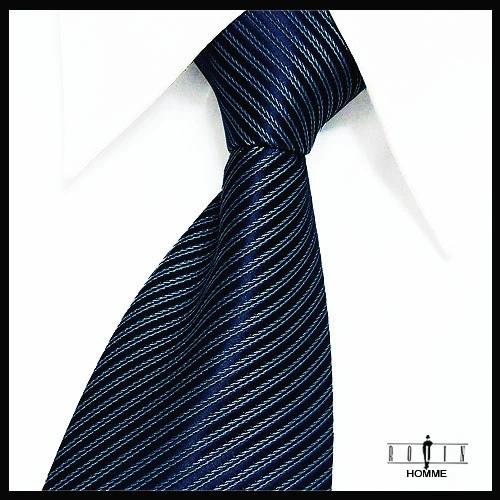 商品簡述: 1.本款領帶為深藍色底、淺藍色線條排列其中,其細緻柔軟的材質及活力自信的條紋花色,都能襯托出您的個人品味,讓你在競爭的腳步中能脫穎而出,成為公司中最耀眼的精英。 適合雅痞上班族及休