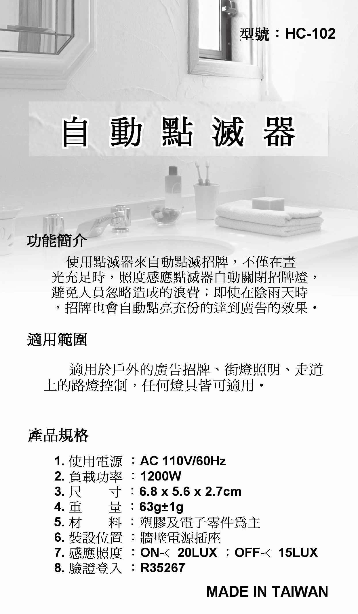 即插即用 不需接線 有光源切斷電源 無光源自動啟動 省電省時又方便 目前市面上尚無此設計"插頭式"安裝 適用於 : 招牌 走道照明燈 夜間警示器啟動器 台灣生產製造 品質有保障