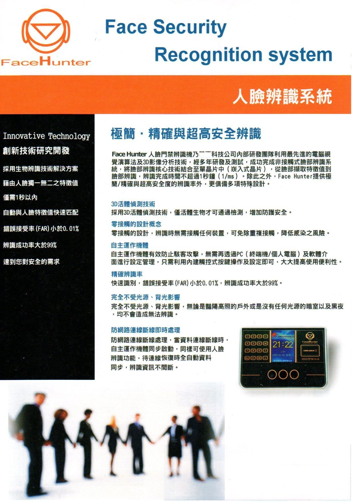 人臉門禁辨識機 Face Hunter人臉門禁辨識機乃利用最先進的電腦視覺演算法及3D影像分析技術,經多年研發及測試,成功完成非接觸式臉部辨識系統,將臉部辨識核心技術結合至單晶片中(崁入式晶片