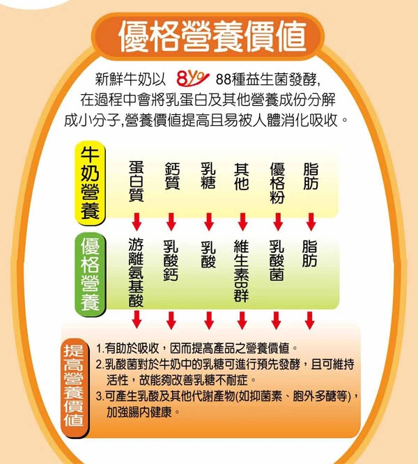 紐西蘭高品質UHT低之高鈣牛奶與8益菌100億活菌,手工發酵而成。 口感綿密滑順、微酸清甜、不添加糖、水、澱粉。 含有乳酸菌、乳酸鈣、乳酸、游離蛋白質及B